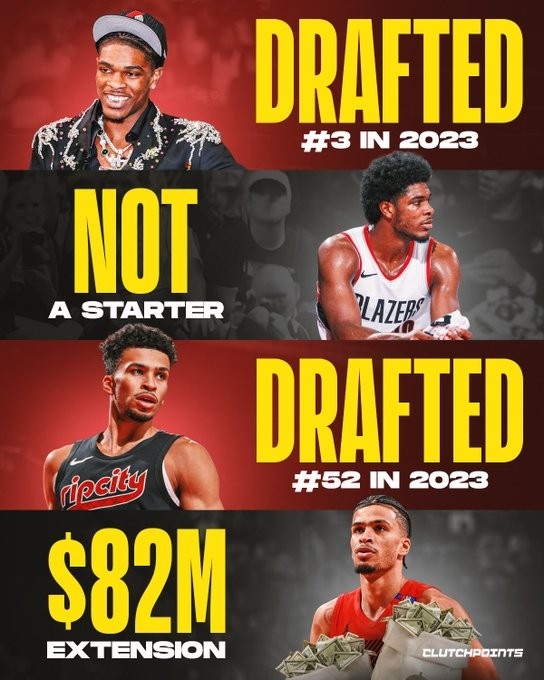 美媒晒图,2023年选秀52顺位卡马拉获8200万续约,同届同队的探花亨德森却前景不明。全文如下: