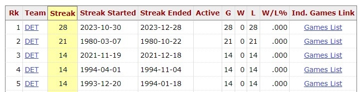 2023年10月到12月,活塞曾有一波28连败,目前这一连败和76人的28连败并列为NBA历史连败纪录,同时活塞的28连败为历史单赛季连败纪录,76人的28连败为历史跨赛季连败纪录。