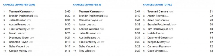 据统计,卡马拉在上赛季制造对手进攻犯规高达91次,全联盟最多,也是NBA自2013年引入这项数据统计后,单赛季第二高!