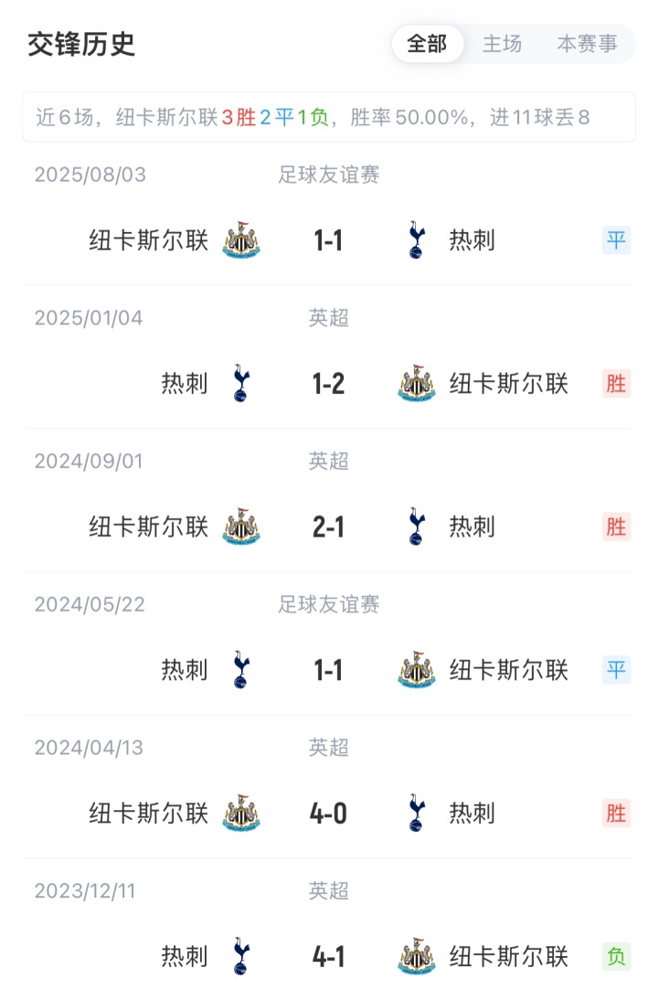 热刺联赛5胜2平2负积17分暂位英超第3,各项赛事近6场2胜;纽卡联赛3胜3平3负积12分暂位英超第12,各项赛事收获2连胜。热刺对阵纽卡已连续5场不胜(2平3负)。