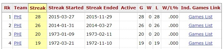 本世纪的第二个十年里,76人曾有一段“相信过程”的时期,2014年1月到3月,球队曾有一次26连败,2014-15赛季到15-16赛季,他们曾跨赛季28连败。