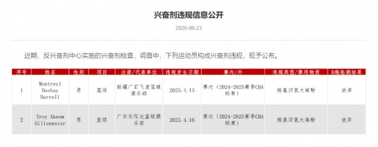 中国篮协在给广东东阳光队(广东宏远篮球俱乐部)下发的通知中说:“在国家体育总局反兴奋剂中心于2025年4月16日实施的赛内(2024-2025赛季CBA)兴奋剂检查中,你单位男子篮球运动员Troy Akeem Gillenwater(吉伦沃特)的A样本尿样检测结果呈大麻酚类(羧基四氢大麻酚)阳性。接到阳性通知后,运动员放弃检测B样本,因此该运动员检测结果阳性成立,表明运动员曾使用禁用物质或禁用方法,构成兴奋剂违规。运动员对该阳性作出了解释说明,并提供了证据材料。运动员能够证明在赛外摄入、使用禁用物质,并且与运动能力无关。接到兴奋剂违规通知后,运动员在规定时间内签署了结果管理回执单,承认兴奋剂违规,接受通知中指控的后果。”